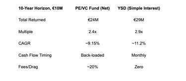 In today's volatile markets, accredited investors and family offices are rethinking allocations. Everyone knows the private equity/VC fund model: aim for 3x gross, but fees and carry often drag net returns down to 2.4x.